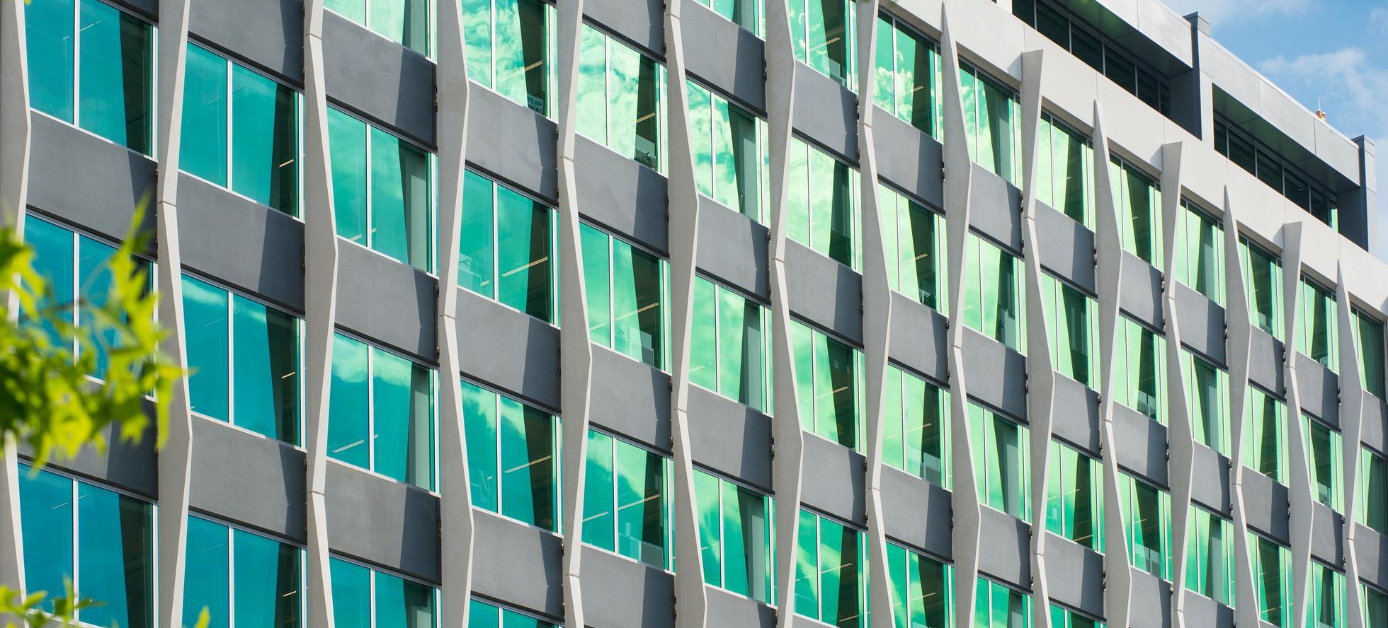 This 10-story 36,735 square foot precast facade was designed with folded triangle faceted insulated wall panels, angled decorative fins, and a deceptive fold from top to bottom of this building.